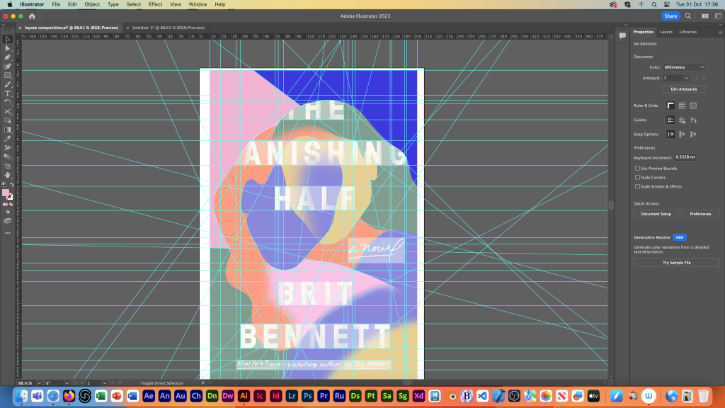 Using Indesign for this book cover I added guidelines using the ruler tool to showcase all the leading lines and shapes that make up that composition.