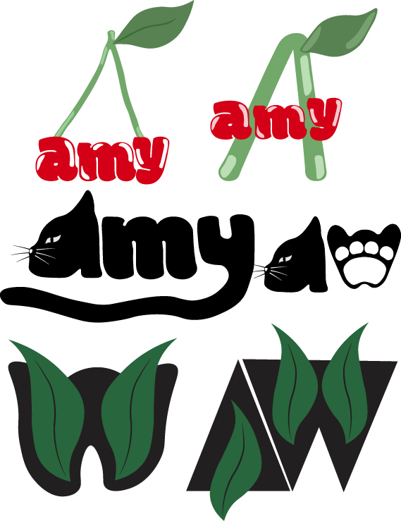 I used the stem of the cherries to create the arch of an upper-case “A” and my first name across the cross stroke, fashioning an “A” and making it all one. The Lettering of “amy” is designed into cherries, using the lowercase to create a rounder look for the cherries. I added a leaf to the stem to further indicate the idea of it being a cherry and highlighted it for a softer tone.