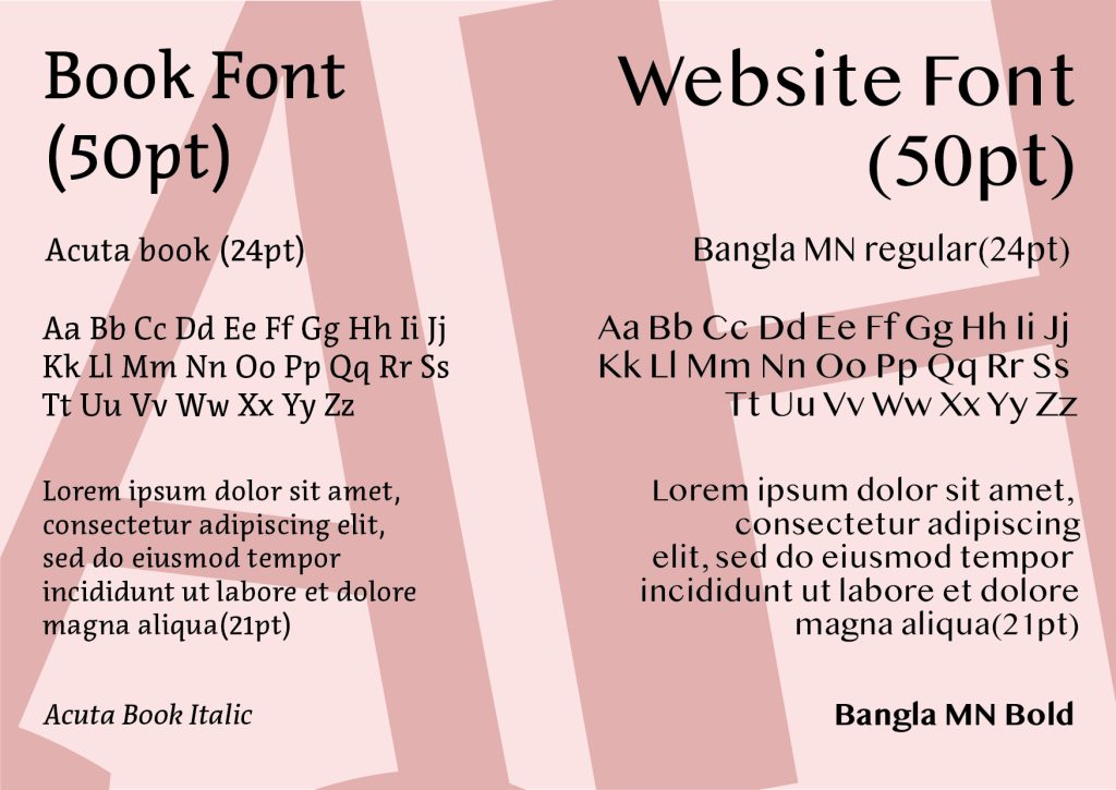 For the website pages, I have picked the font Bangla MN in regular and bold. This is a sans-serif font that is very clear and easy to read on a screen. It will be easily useable on most backgrounds which is important. I will use the regular version for paragraphs and snippets of information. The bold version will be used for headings.