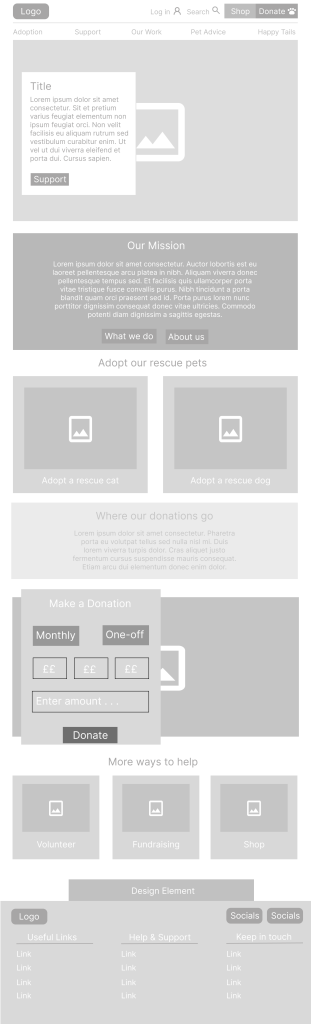 For my mid-fidelity, I changed the layout again as I found this way I can include images and content together. One feature a lot of animal charities have when you first click on their page is content that garners sympathy from the viewer by using an image showing an animal in distress or in an unhappy way while giving you a choice to help animals by donating or adopting. This is a smart move as it pulls on the heart strings of potential donors the second they see the website.