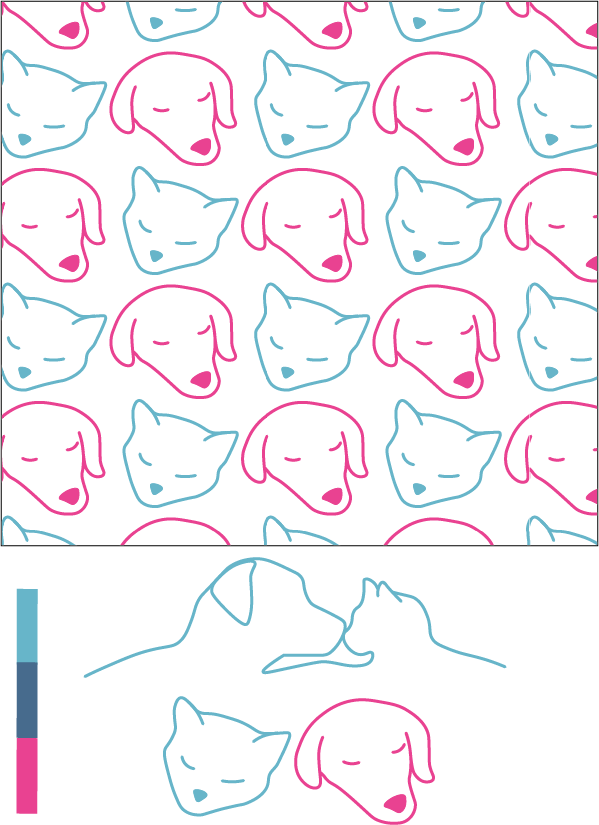 Taking a lot of design from the logo, I made two main design elements including a cat and a dog to represent the charity. I added the face of a sleeping cat next to the sleeping dog for a more light-hearted style. I decided to create a pattern using this which can be used in the website design and any future campaigns or social media designs. The idea for the Silhouette of the cat and dog was to be placed at the bottom of the website as I noticed a lot of charities have a design element near the bottom of their page, so I fabricated something with symmetry in the same style of the other line drawings to put at the bottom of websites pages.