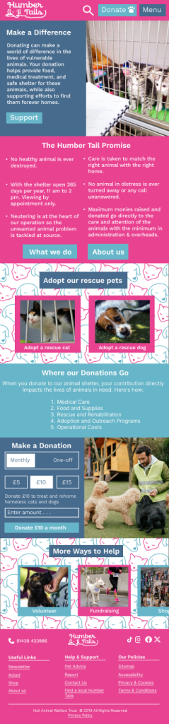 For the content of the home page, I took inspiration from other animal shelters and what they involve. I thought it was important first as well for the audience to see what the charity’s mission and goals are. Being as transparent and trusting as possible I included about where the donation money goes on the home page. I added lots of call-to-action buttons within the content and at the very top and bottom of the page, this was something the original charity website was lacking so I emphasised it.