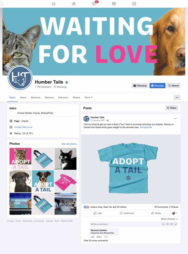 On the right of the Facebook page, I’ve displayed a post about one of the campaign products. The post states where the money goes when you buy one of the products and where to get it from. This makes the charity very trusting and transparent towards the audience. This makes the audience feel good about purchasing these products knowing the money is going straight to the animals and it helps the charity as they will be promoting the Humber Tails charity and campaign.