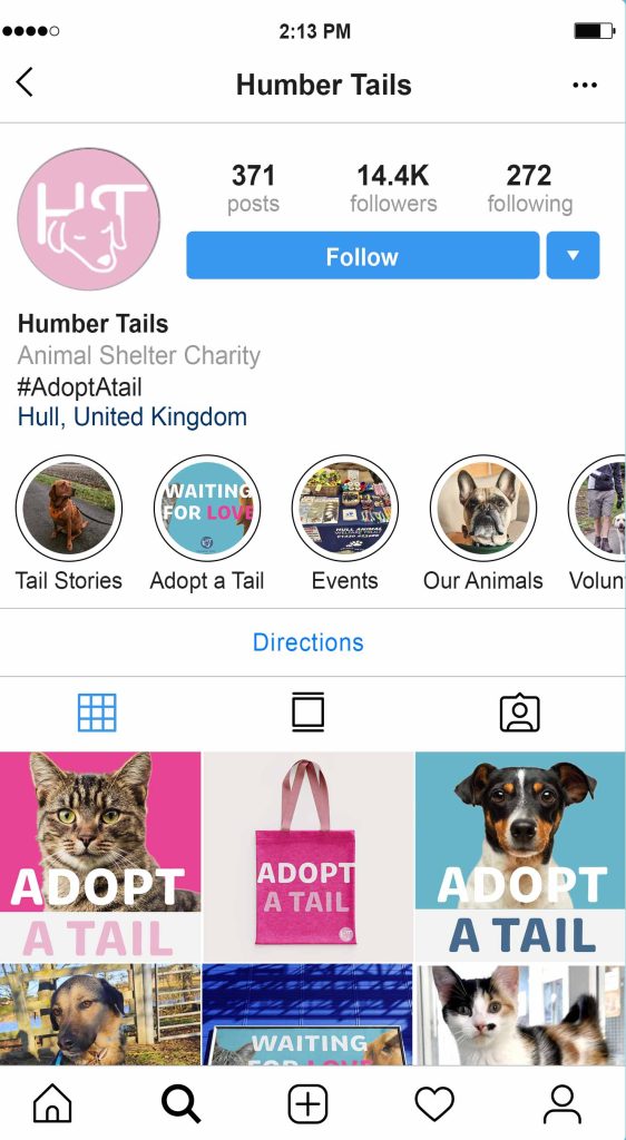 For the Instagram profile, the images are similar to the Facebook photo, including the campaign products and posters to promote and show what marketing Humber Tails would do on social media. Whilst involves photos of the animals within the shelter and those who have finally found their forever homes. The details of the stories showing off everything the charity does help create a welcoming feel to the charity overall and let the audience know how important their cause is.