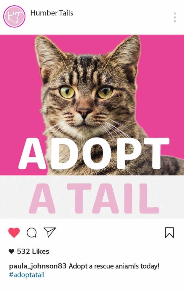 The Instagram post showcasing one of the campaign posters and a description involving the #Adoptatail to further promote the tag to the audience and connect to them.