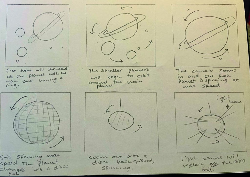 The starting scene of my animation will be the planetary scene which will involve my main planet which will differentiate from the rest with the ring around it. I’m including other smaller planets that will orbit around this main planet. The colouring and style will be futuristic. For the background I plan for it to be black with white dots to represent vast space, this background can then easily transition into a disco background with little or no change at all.