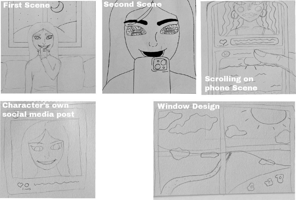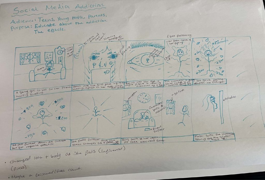 With the theme of social media addiction, the animation follows a character’s journey through their fixation on social media. Showing how it affects their mental health and how they feel as they progress through this addiction. The aim is to educate teens, young people, and parents about how social media can harm their minds and thoughts without realising it. To portray the dread and anxiety of fixating on social media to the audience.