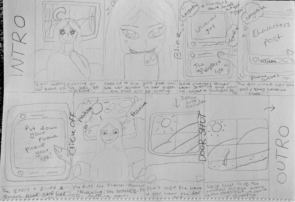 As she scrolls through, the viewers see all the unattainable standards these platforms set up. Negative thoughts will slowly start creeping up in the character’s mind. Text will be added around the phone so the viewer can understand the character’s feelings and emotions better. As she scrolls, one of her posts comes up in panel five; the post has zero likes, she does not feel good enough, and her negative thoughts swell up; the text around the phone increases. Just as she feels her worst, in panel six, a different kind of post crops up, a positive one with the quote, “Put down your phone, pick up your life,” This stops her in her tracks. She turns off the phones.