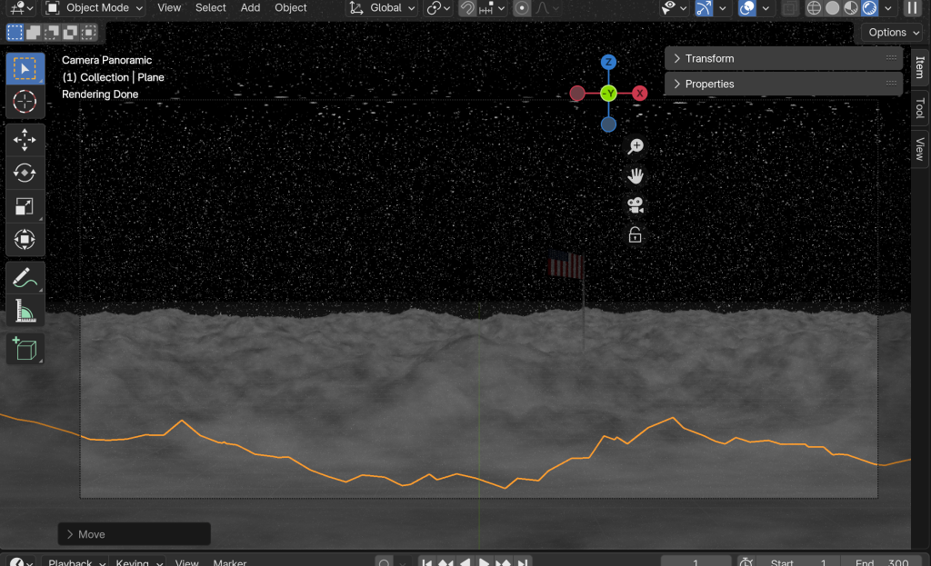 For my final video, I adjusted the camera settings and followed all the instructions on how to export the video to YouTube using Premiere Pro VR options. The Moon Landing video came out structurally and visually correct; however, the quality is low, as I chose the lowest image quality and render settings to expedite the process. In the future, I would change this to better settings to achieve greater quality. I explored beyond the set exercises and attempted to use shading and geometry nodes visually.
