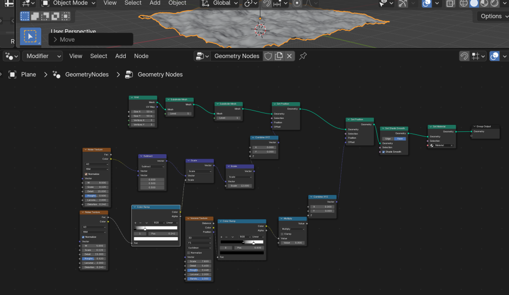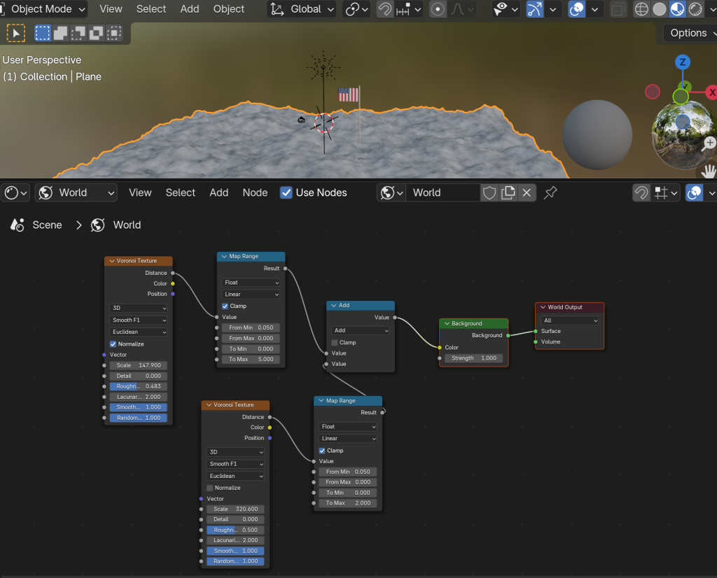 Creating an environment like this is essential in 360 videos, as it feels immersive for the viewer. I added very low lighting and a vast feel to make the scene realistic. Including a stretch of stars that the viewer can view by looking around, and the same goes for the moon material. The quality does let the feeling of immersion down, however, I’ve learnt from this and will improve on it in future. As this is an exercise and the geometry nodes took a long time to figure out, I didn’t add sound, but the moon would not make a sound, so it works for this instance. The colours are muted and dark to express that realistic feel.