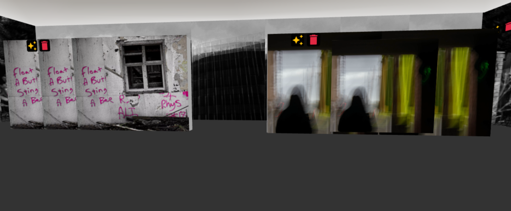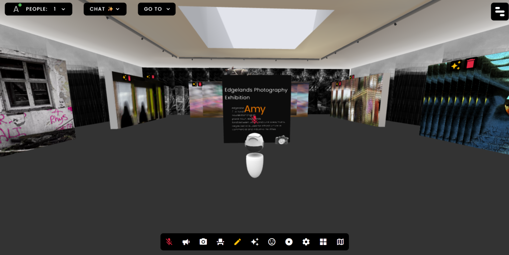 The following exercise was within WebVR, a media format I had never used before, but I quickly gained a good understanding. My WebVR room was fabricated into a photography Gallery based on a project I did in college. I layered the photographs to present them in an interesting way and included an introductory box in the middle so that viewers understand it’s a photography exhibition named Edgelands. I added music to set the soft and urban tone of the gallery.