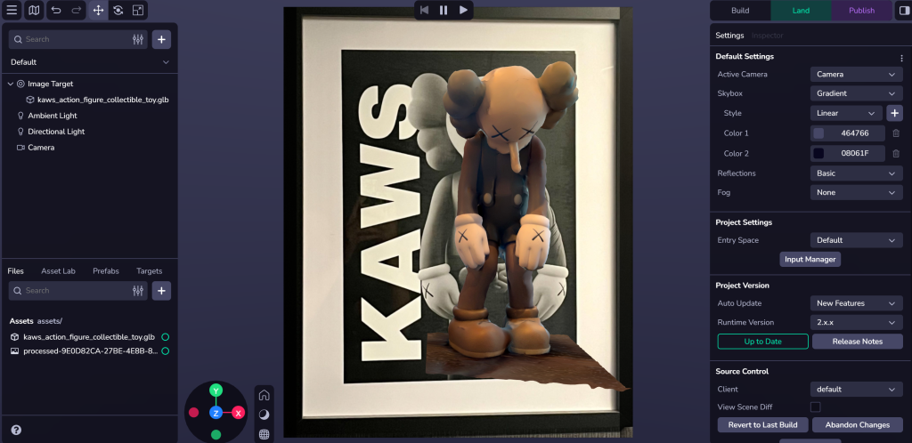 For the third exercise, we used 8th Wall to curate different web-based AR experiences. I practiced with the workspace of 8th with the intro video to become comfortable with the program. After that, I focused on fabricating an image target. I used a poster in my room as my target. I had to choose something simple to replicate. Using Sketchfab, I found a 3D model of the poster’s doll. This feature would be a fun way to promote products, such as by using a poster and adding animation details to make it more advanced. For the best user experience, I ensured that the 3D model is in clear view when you scan the poster, allowing viewers to move around it and explore beyond the poster’s figure. That’s why I chose this poster as it has something it can showcase in the 3D world.